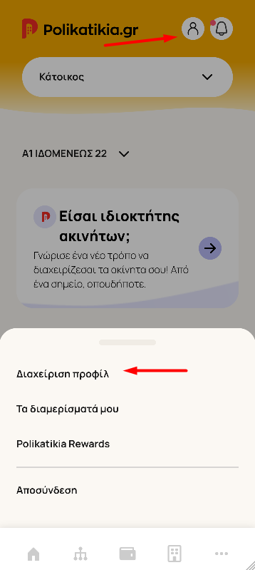 Πατώντας στο εικονίδιο με το ανθρωπάκι στην αρχική οθόνη και στη συνέχεια επιλέγεις Διαχείριση Προφίλ, μεταφέρεσαι στο Προφίλ Χρήστη.