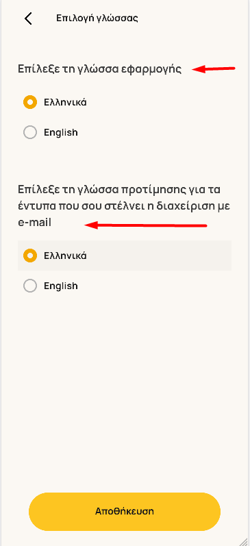Γλώσσα: Μπορείς να επιλέξεις τη γλώσσα προτίμησης της εφαρμογής καθώς και των εντύπων, ώστε τα έντυπα που σου αποστέλλει η διαχείριση με email να τα λαμβάνεις στη γλώσσα που επιθυμείς.