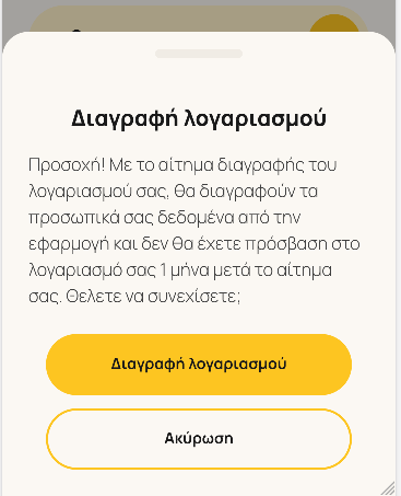 Αίτημα Διαγραφής Λογαριασμού: Εάν επιθυμείς να διαγράψεις τον λογαριασμό σου, μπορείς να υποβάλεις αίτημα διαγραφής. Σημειώνεται ότι η διαγραφή του λογαριασμού θα πραγματοποιηθεί 1 μήνα μετά το αίτημά σου, και όλα τα προσωπικά σου δεδομένα θα διαγραφούν από την εφαρμογή.