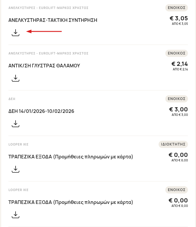 Επιλέγεις το βελάκι που υπάρχει κάτω από κάθε δαπάνη που εμφανίζεται στην έκδοση κοινοχρήστων.