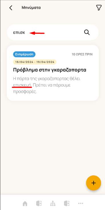 — Αναζήτηση με λέξη-κλειδί. Αν θυμάσαι μια συγκεκριμένη λέξη ή φράση (π.χ. «ασανσέρ», «συντήρηση», «νερό»), γράψε τη λέξη στο πεδίο αναζήτησης. Θα εμφανιστούν μόνο τα μηνύματα που την περιέχουν, ώστε να πας κατευθείαν σε αυτό που ψάχνεις. Ιδανικό για να εντοπίσεις γρήγορα παλιές ανακοινώσεις ή συγκεκριμένες πληροφορίες.